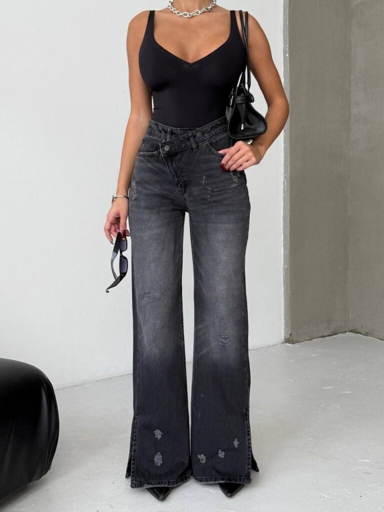 Išskirtinio ir labai gražaus modelio džinsai. Asimetriškas liemuo, skeltukai apačioje suteikia išskirtinumo.