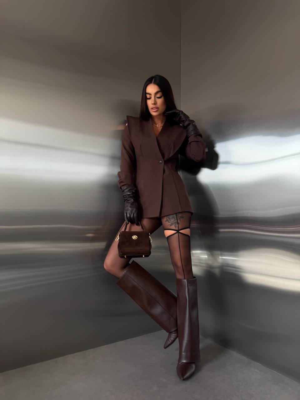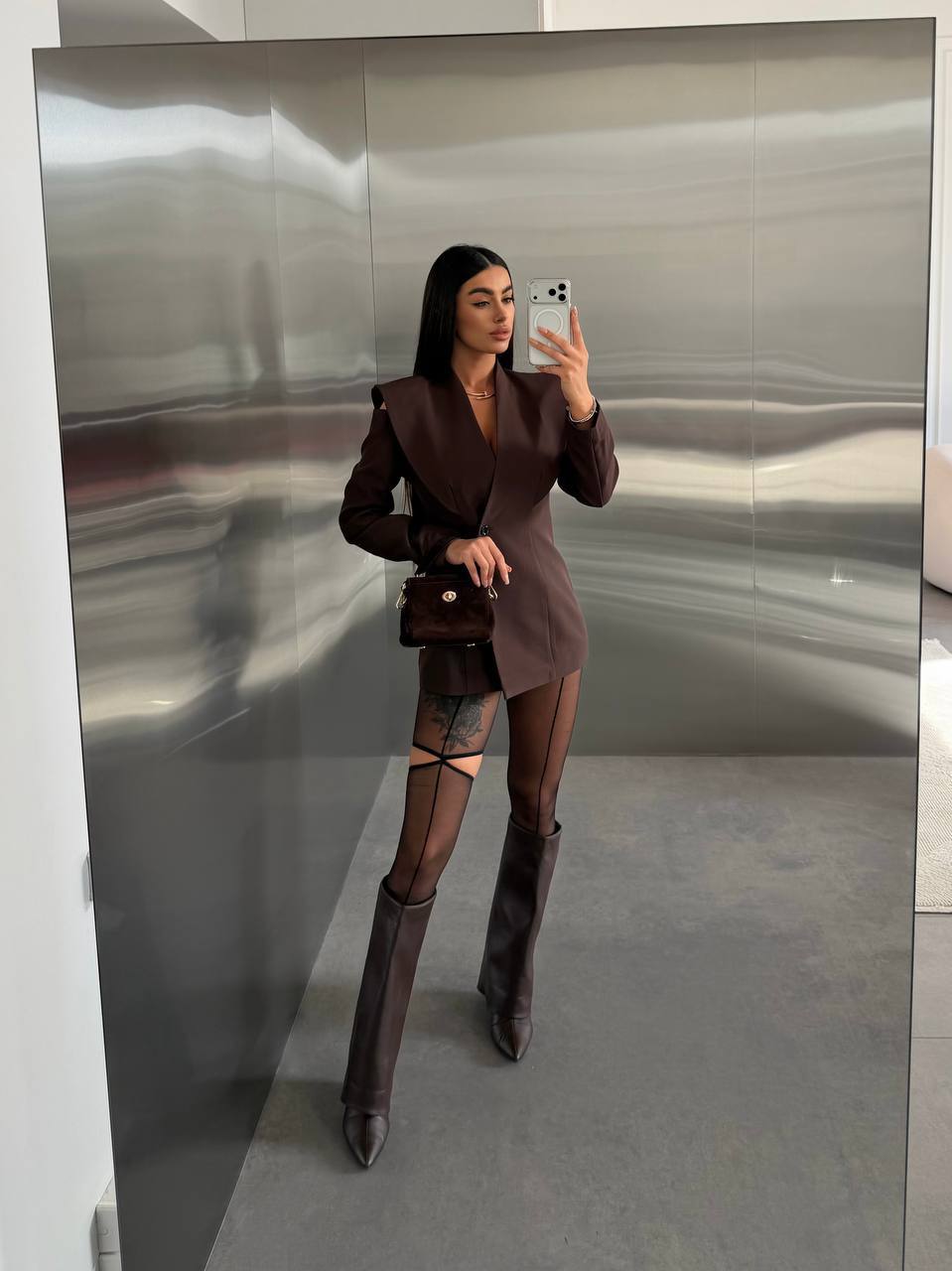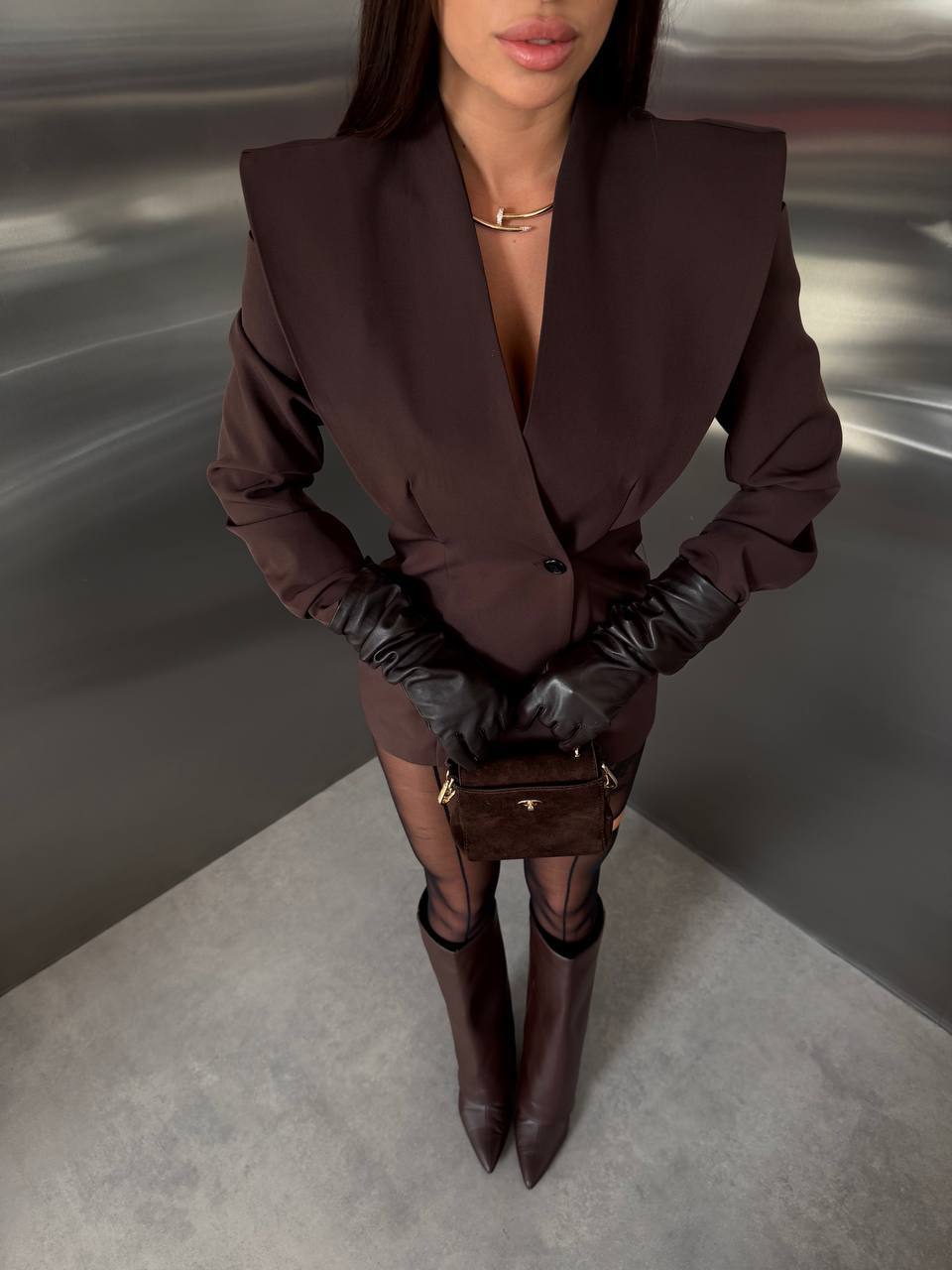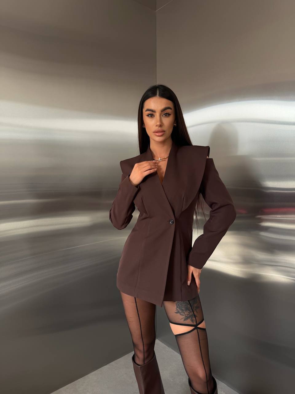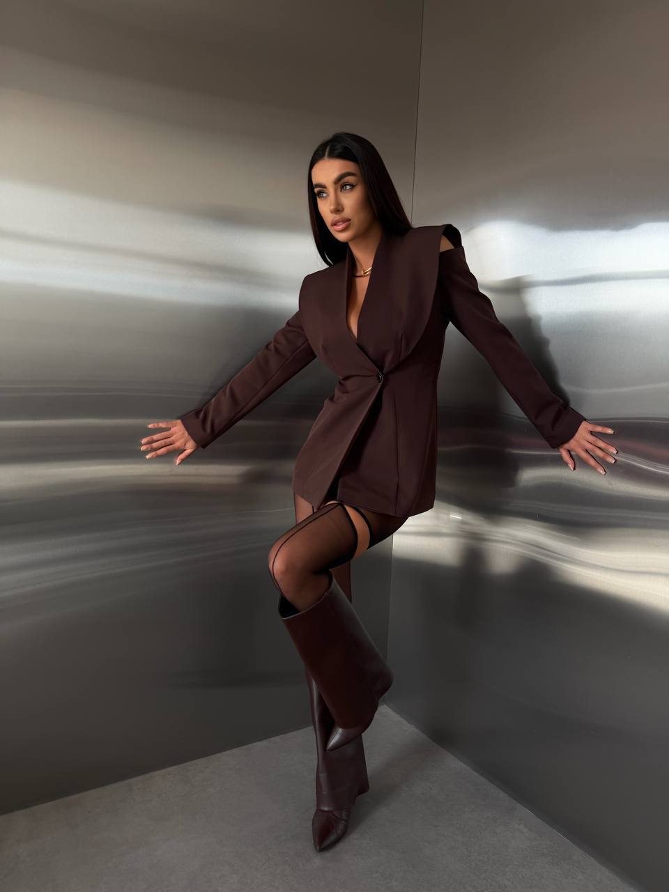 Begalo gražaus modelio švarkas. Įliemenuotas, atvirais petukais, šiek tiek ilgesnis. Su pamušalu. Tamsios, šokoladinės spalvos.