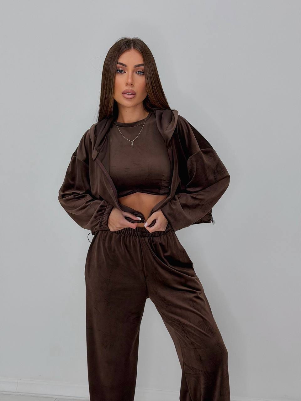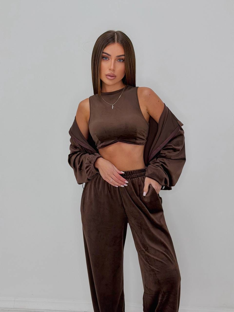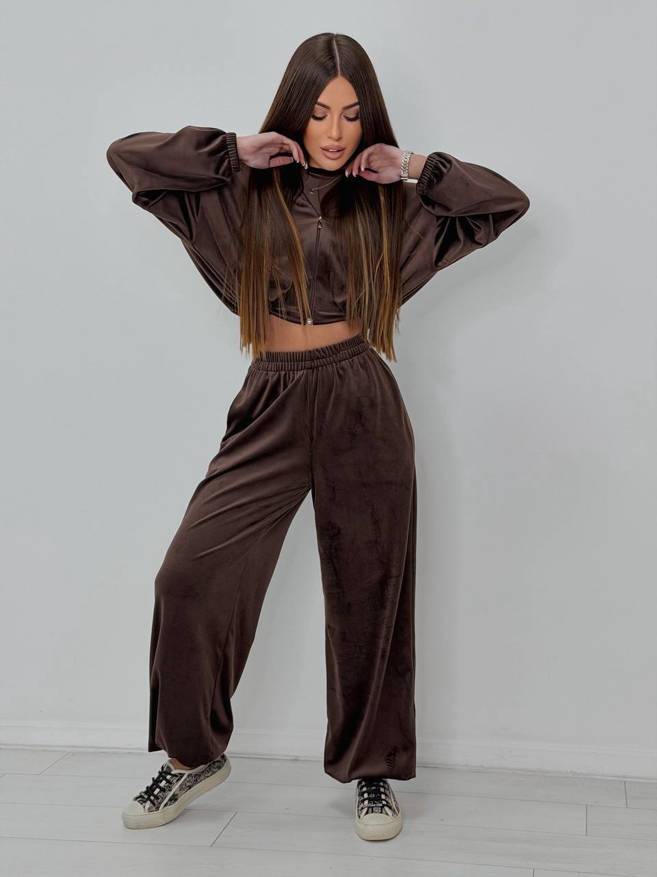 Patogumas ! Kai jau atrodo, jog turi patį patogiausią – pasiuva dar patogesnį. 3-ų dalių laisvalaikio kostiumas. Kelnių ir džemperio apačia reguliuojasi, todėl jis tampa dar universalesnis. Kelnes galite nešioti tiek plačiais, tiek sutrauktais galais. Džemperiuko plotį taip pat galite pasireguliuoti pagal poreikį ir figūros tipą. Vienas dydis, kuris tikrai puikiai atrodys Nuo S iki L nešiojančioms, bet būtinai įsivertinkit dydi pagal išmatavimus. Audinys yra tamprus. Kostiumas nėra labai storas, todėl idealus variantas šiltėjantiems orams.