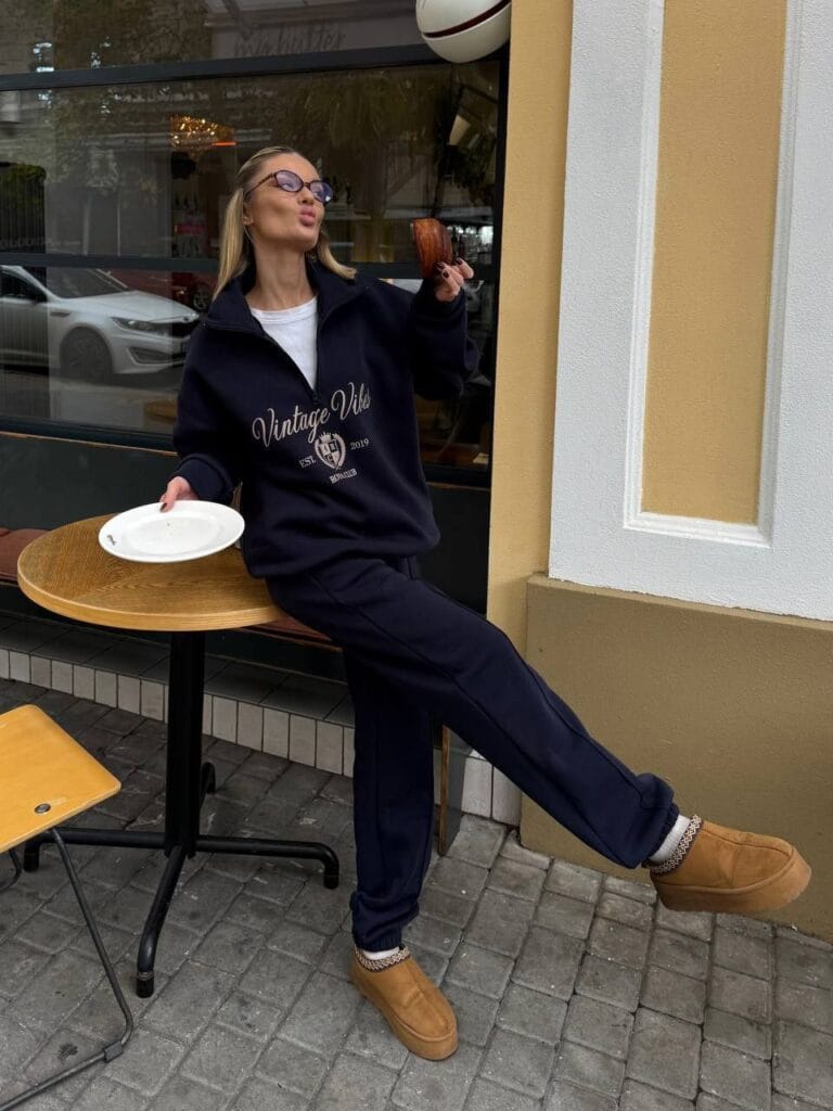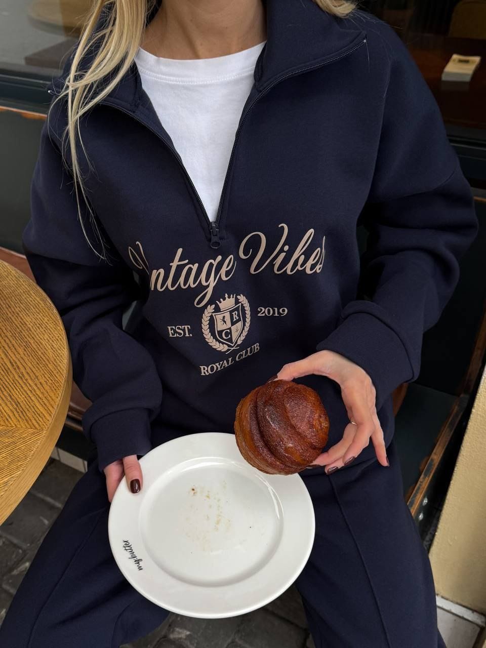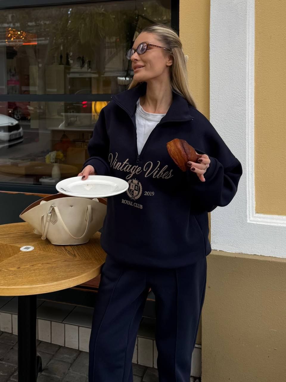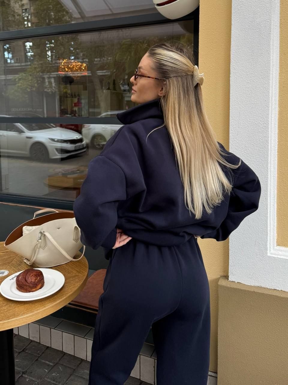 Šiltesnio modeliuko ( su pūkeliu) laisvalaikio kostiumas. Mėgstančioms klasiką ir patogumą. Tamsi ( old money stiliaus) mėlyna spalva – lengvai derinama. Norint šiek tiek išskirtinumo puikiai dera su baltais marškinėliais po apačia.