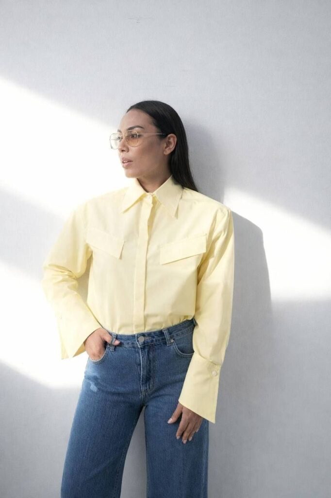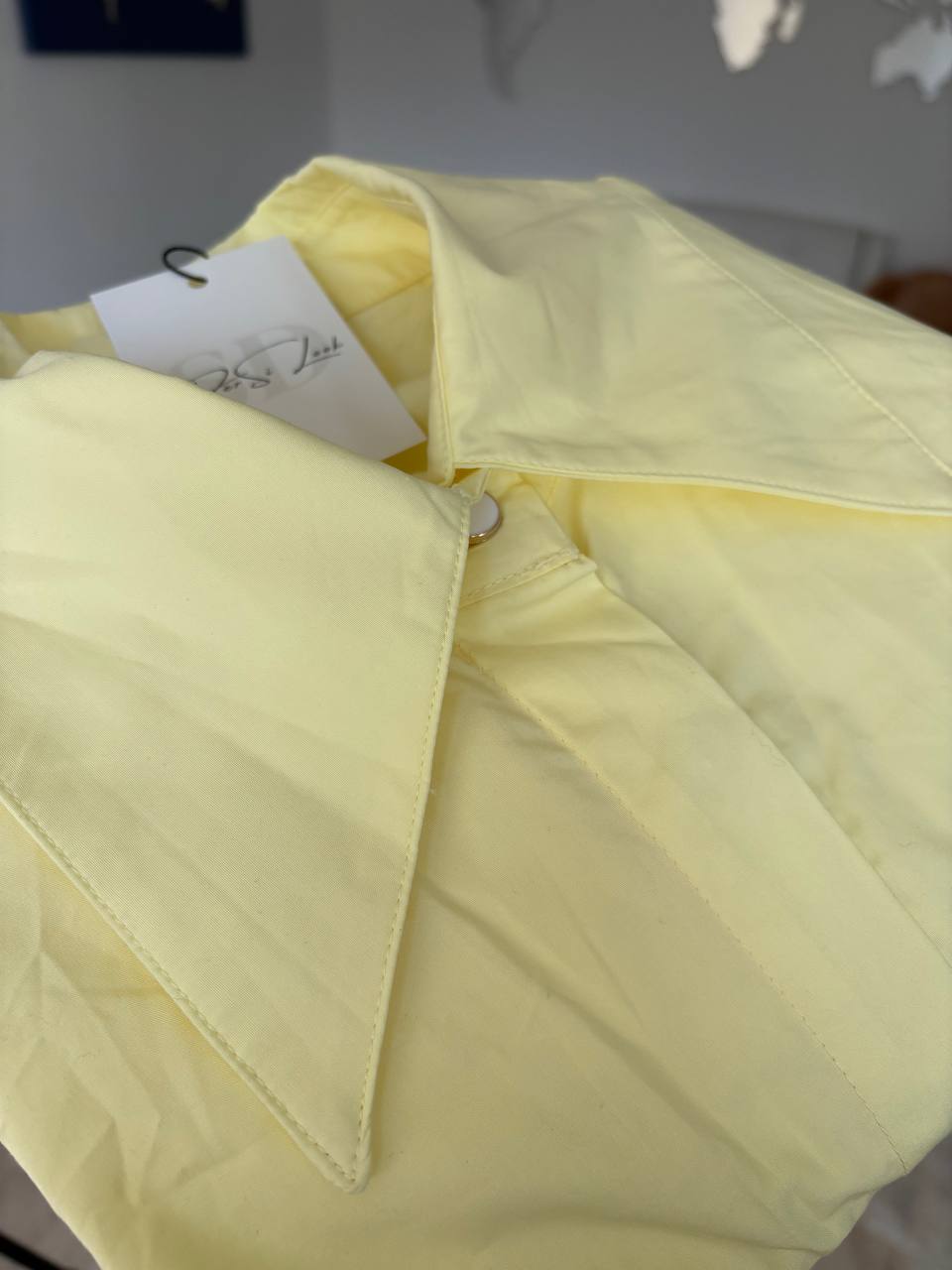 Prabangaus, klasikinio modelio marškiniai. Su petukais, griežto kirpimo rankogaliais. Pastelinės geltonos spalvos. Šiek tiek didinti, todėl svarbu gerai įsivertinti išmatavimus.