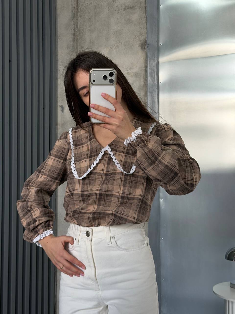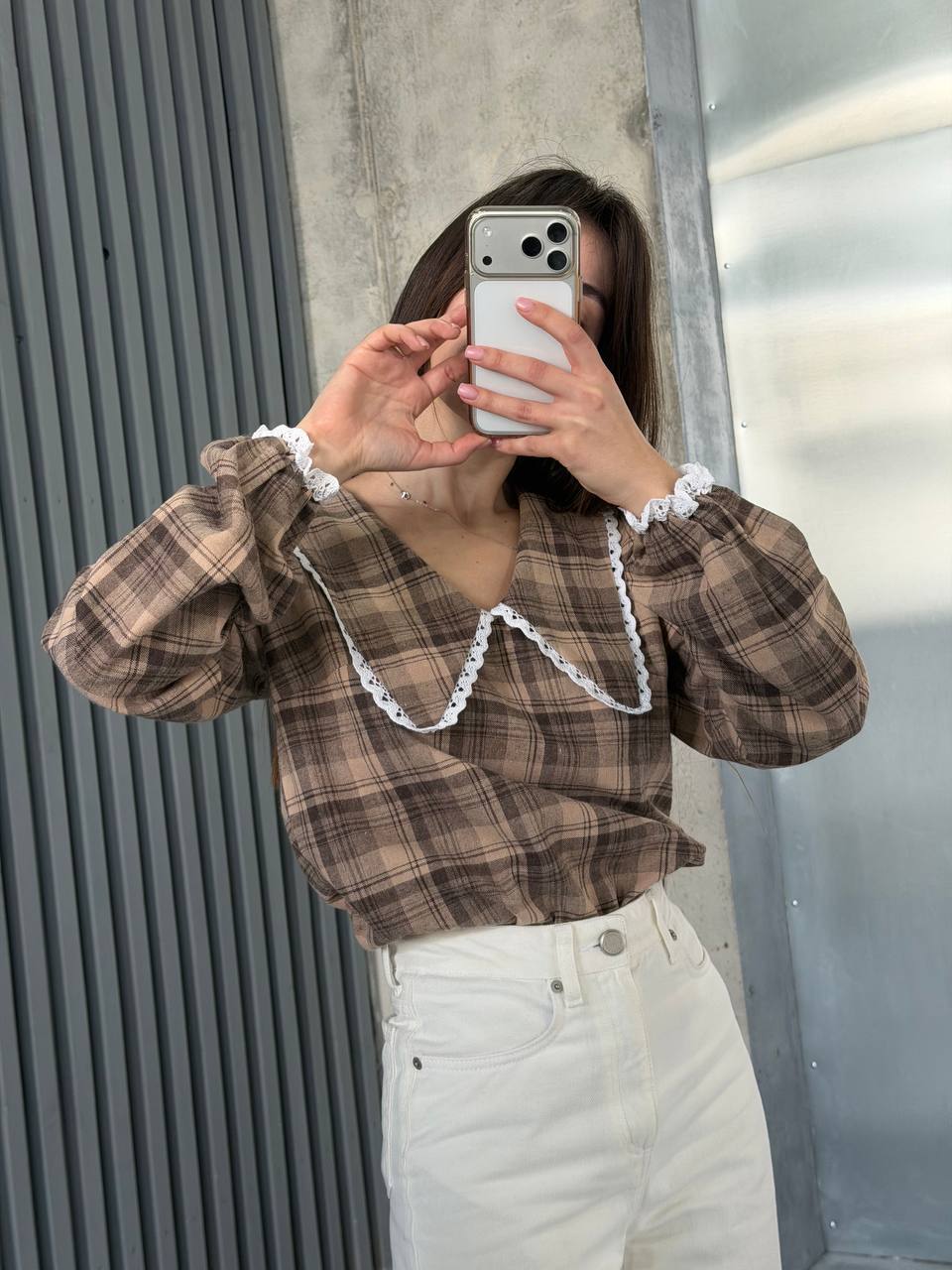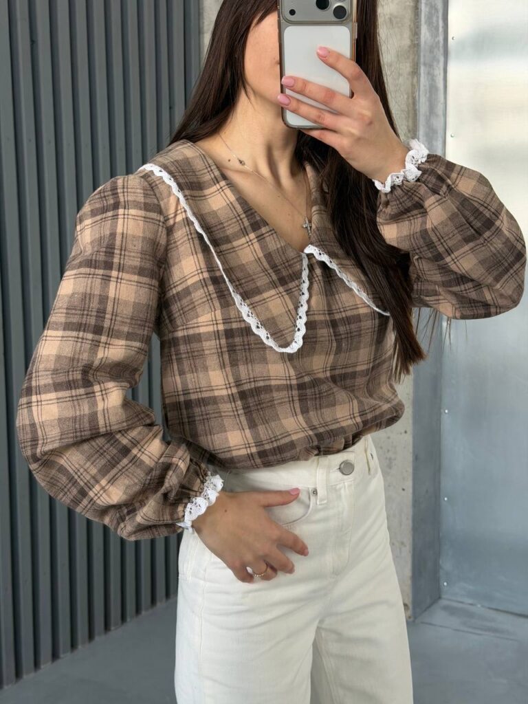 Elegantiško modelio palaidinė. Apačia lygaus, tiesaus kirpimo. Rankovės ir apykaklė puoštos mini nerinukais.